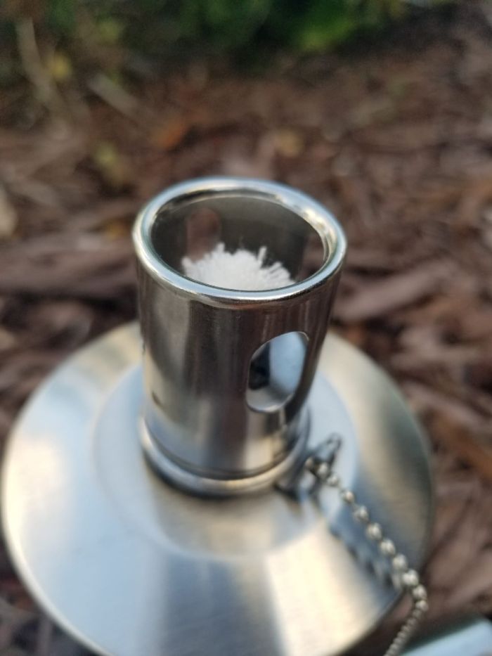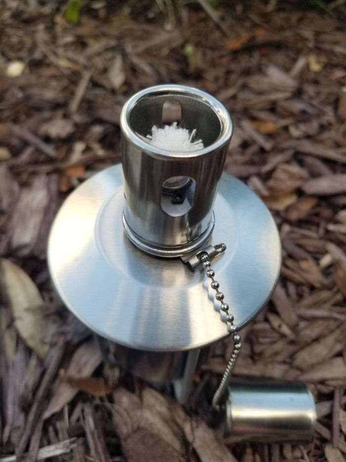 Fill + Light the Torch Canister: Add lamp oil, place it into the holder, and ignite.