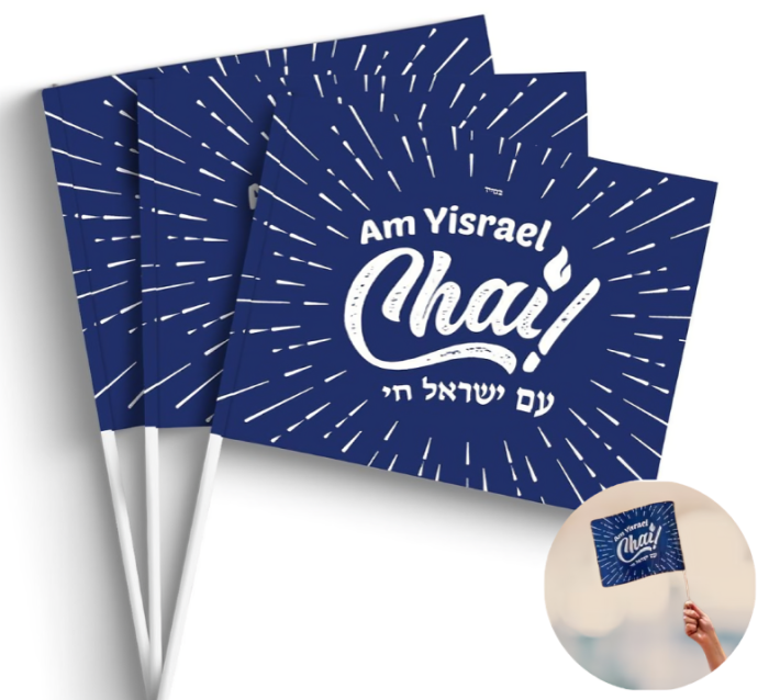 Celebrate Jewish strength, resilience, and unity with this Laminated Am Yisrael Chai Flag, the perfect symbol for a variety of Jewish events. This beautifully crafted flag features the bold phrase “Am Yisrael Chai” (עם ישראל חי), which translates to “The People of Israel Live,” making it an inspiring emblem of Jewish pride, Jewish unity, and Jewish resilience. Measuring 8.5 x 11 inches and laminated for durability, the flag is mounted on a sturdy 16-inch plastic stick, making it easy to hold and wave at any event.
