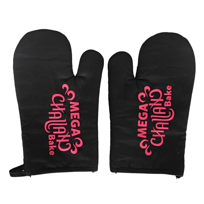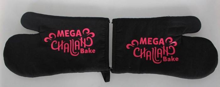 These gloves are 100% cotton, and are pre-printed with the Mega Challah Bake logo.
