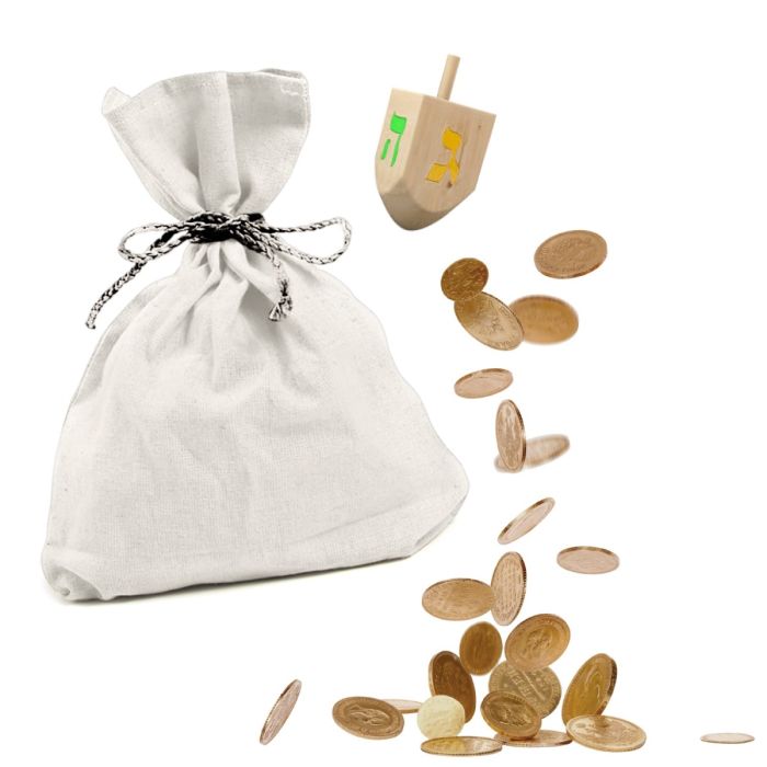- Dreidel, Dreidel Game Instruction Card, set of 25 coins individually wrapped, Canvas Bag