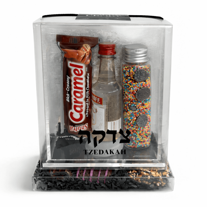 Size: The Tzedakah Box measures 5.5 x 4.4 x 7.2 inches, providing a perfect fit for the treats and vodka inside.