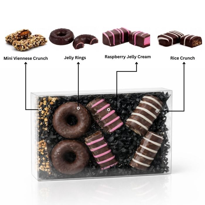 An assorted selection of four types of premium kosher chocolates from our collection, thoughtfully selected and beautifully packaged with black shredded paper for an elegant presentation.