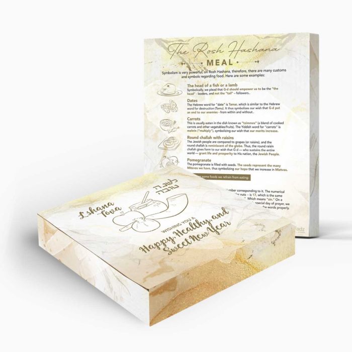 This box comes in two styles, one has a blank back, and one has an explanation of the Rosh Hashana Meal & It's Simanim. While you can let us know which one you would prefer, due to a barcoding error in the factory we can not send you one or the other, the order would be for any of these two designs.