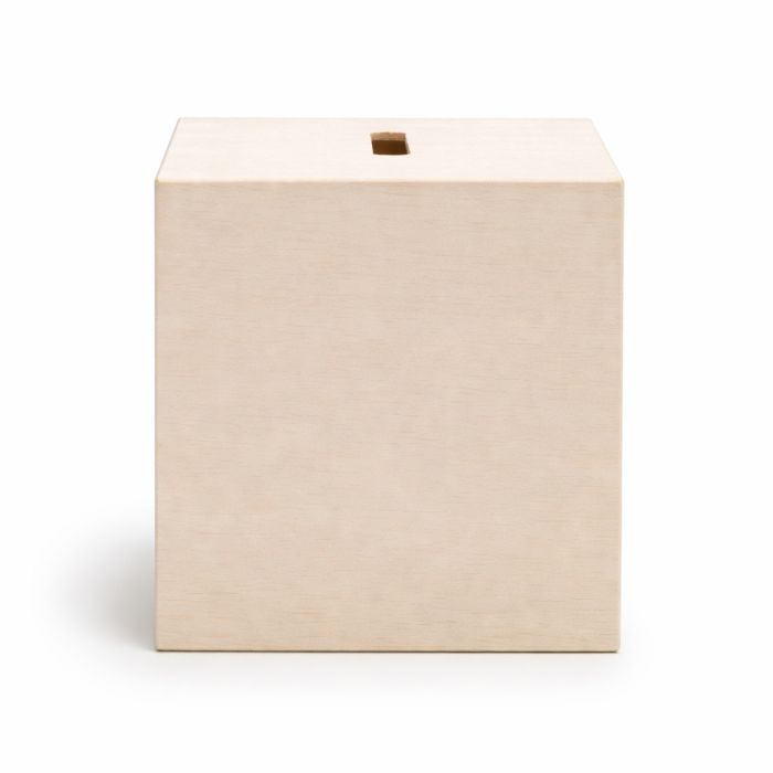 Blank unfinished wooden pushka, ready to decorate. Cube-shaped box with a slot on top and a removable bottom shelf.