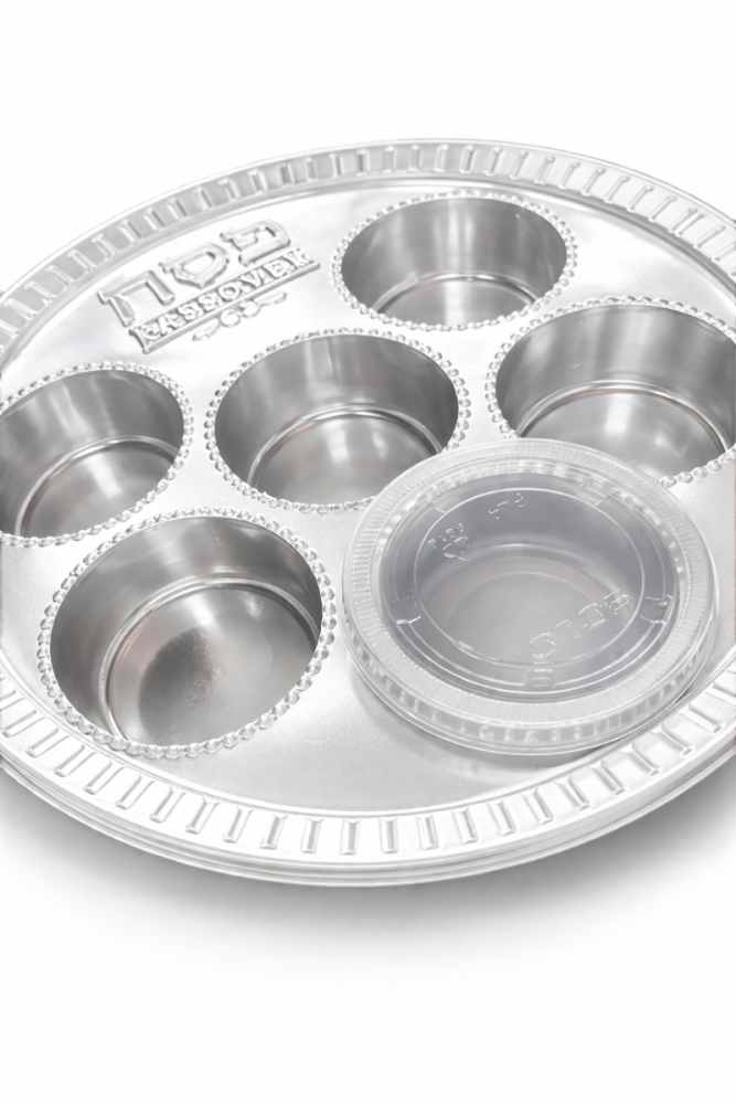 Add sophistication and convenience to your Pesach table with this deluxe silver-like Seder plate. Designed with six deep 3oz pockets to securely hold each symbolic food, this elegant disposable plate blends tradition with practicality.
