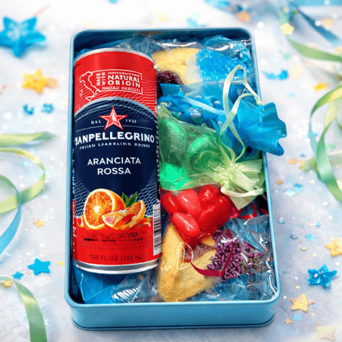 Smaller FILLED Happy Purim Shaloch Manos Tin Drink, Hamantashen, Chocolate, Mints, Jelly Beans - Price includes shipped, ship to individual adresses - - -