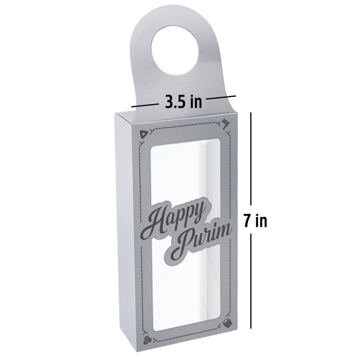 The Purim Wine Hanger Box is the perfect addition to your Mishloach Manot gift! Measuring 3.5x7 inches, this box features a clear window front and is foil-stamped with a "Happy Purim" message. Top off almost any bottle with these bottle hanger boxes for uniquely decorative shaloch manos.