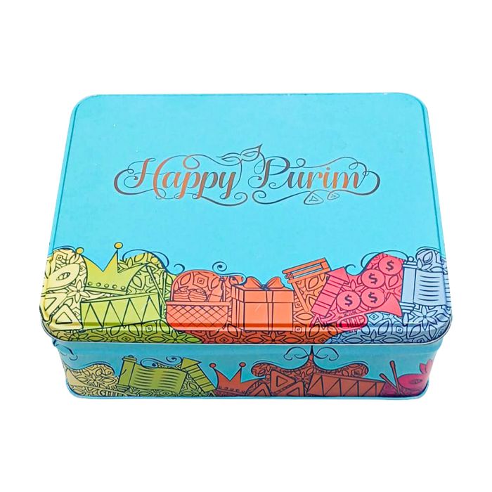 Filled Large Tin Happy Purim Tea Box - Elegant Option - SHIPPED INDIVIDUALLY TO ADDRESSES