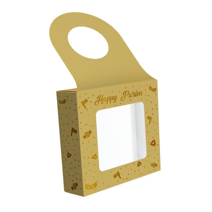 Shaloch Manos Square Wine Hanger Box - Size 3.5x3.5 inches - Front says Happy Purim - Has Clear Window Front - Foil Stamped Happy Purim