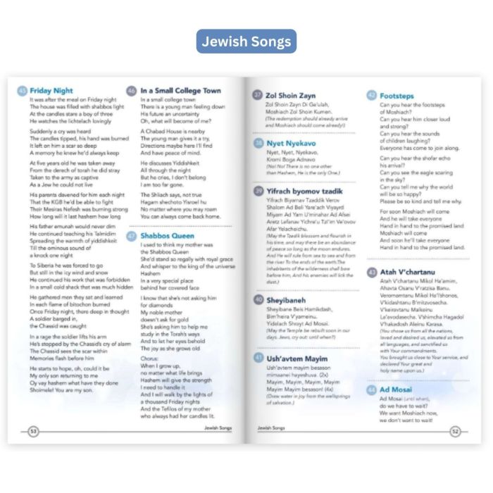 47 Jewish Songs: A mix of niggunim, Hebrew classics, lively Shabbaton favorites, and meaningful English songs