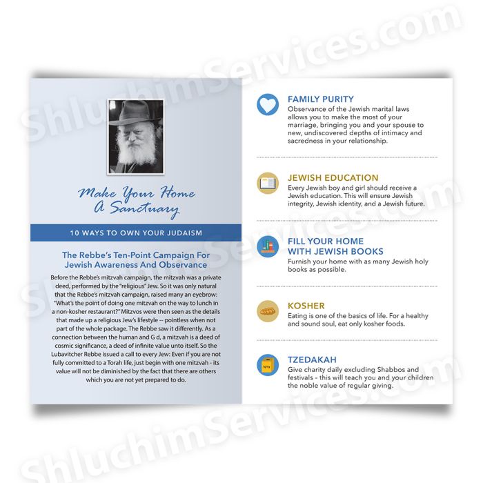 The "Make Your Home a Sanctuary â 10 Ways to Own Your Judaism" brochure is a beautifully designed, powerful educational tool that introduces ten foundational mitzvot (Mivtzoim) that can uplift every Jewish home. Whether youâre handing it out during mivtzoim, including it in welcome or Shabbos packages, using it in a school setting, or sharing it at community events, this brochure is an effective and inspiring resource for outreach and engagement.