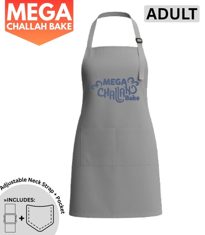 Elevate your Challah Bake experience with this high-quality Grey Cotton Mega Challah Bake Apron, featuring stylish blue writing. Designed for comfort, durability, and functionality, this apron is perfect for Mega Challah Bakes, community events, Hafrashas Challah gatherings, and personal challah baking for Shabbos, Shabbat, and Yom Tov.