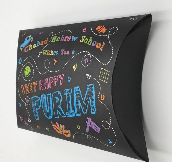 This chalkboard Hebrew School Purim Pillow box wishes you a Happy Purim from Chabad Hebrew School on the front (along with Purim illustrations including a Megillah, mask and Hamantashen), while explaining all about the 4 mitzvos of Purim on the back.