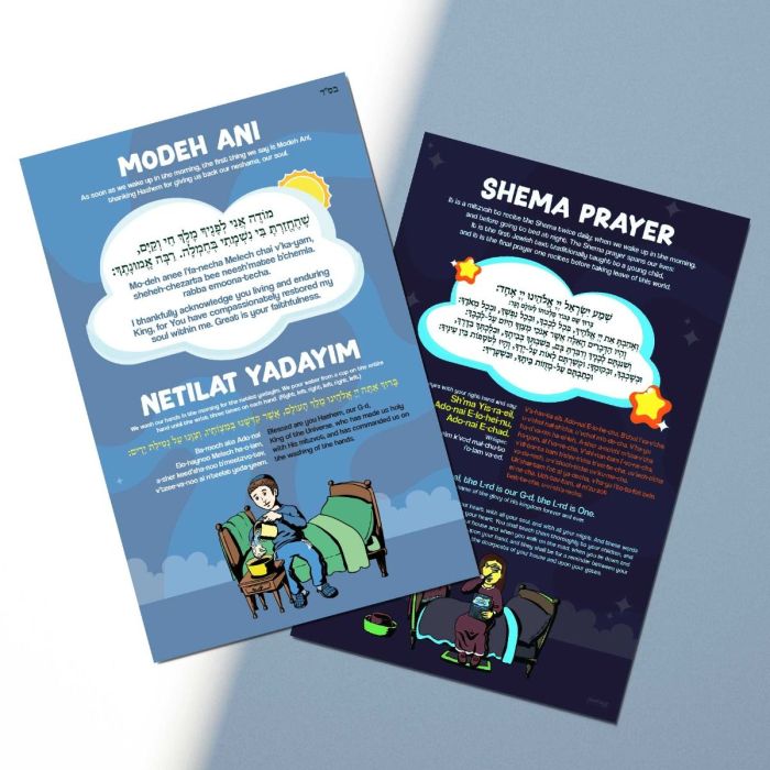 The card has Modeh Ani and Shema in Hebrew, English, and Transliteration (with a short explanation of when to say each and what prayer is about)!