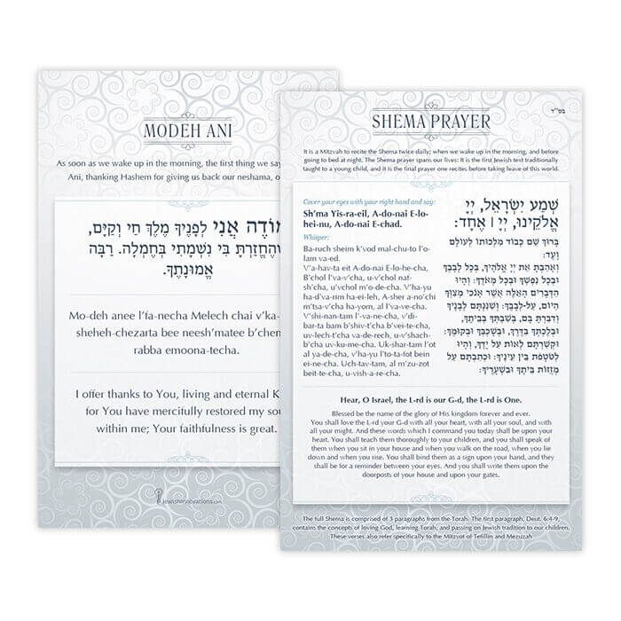 The card has Modeh Ani and Shema in Hebrew, English, and Transliteration (with a short explanation of when to say each and what prayer is about)!