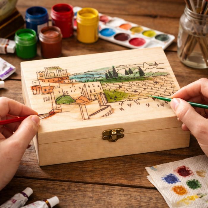 Large Wooden Purim Tea Box – Jerusalem & Western Wall Design