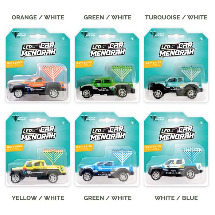 LED LIGHT UP CAR MENORAH ON PICKUP TRUCK - Yellow / Green The items is bundled as Packs of 6, Case Quantity of 240. The Weight for each bundle is 0.73 lbs for the 6 Pack, 29 lbs for the case. The Dimensions is 18.9 L x 18.11 W x 15.75 H inches for the case.