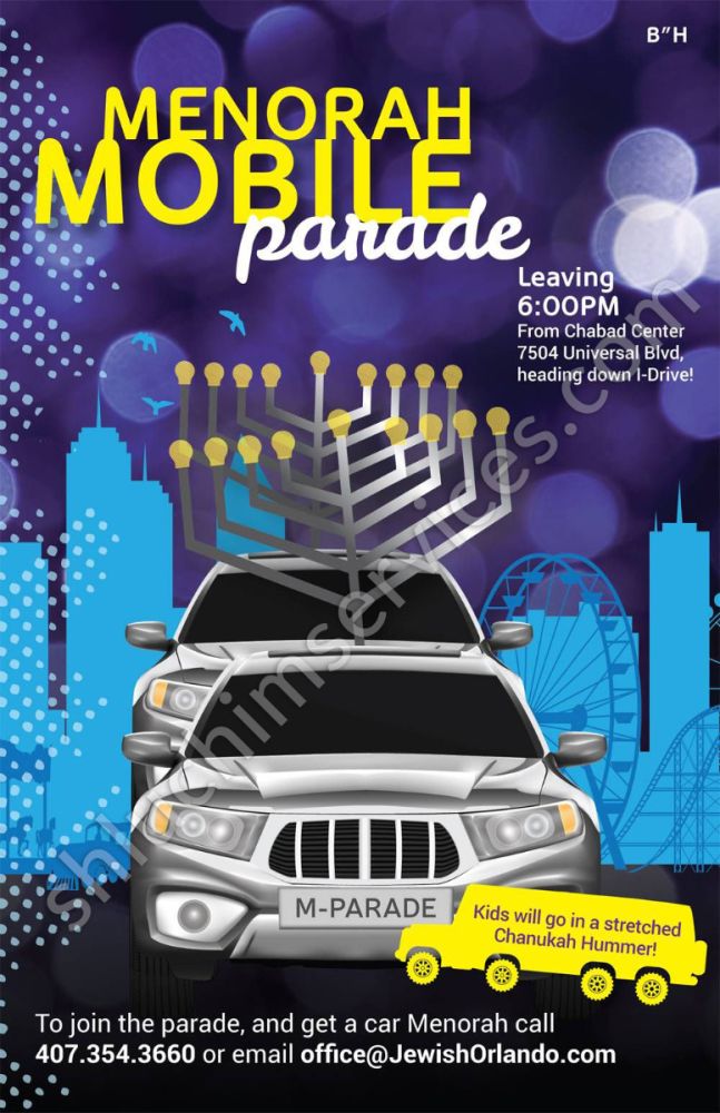 Postcard design for your mobile Menorah parade This is an 8.5x5.5. Can be customized to size. Please see our special Printing Prices for Chanukah We will iy"h match or beat any printing prices.