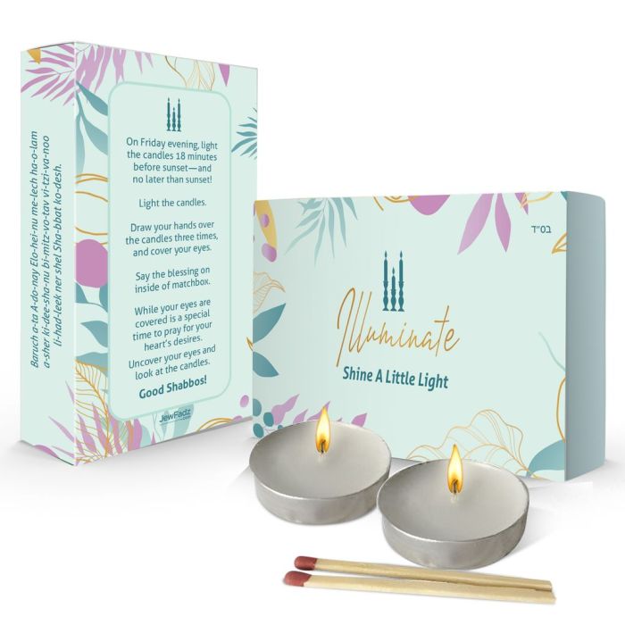 »Each box includes the candle-lighting blessings in Hebrew, English, and transliteration, and also serves as a compact educational guide.