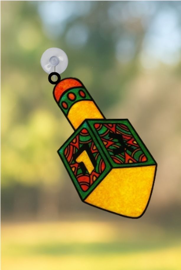 This Dreidel suncatcher is perfect for decorating windows during the Festival of Lights, adding vibrant color to homes and Jewish classroom windows.