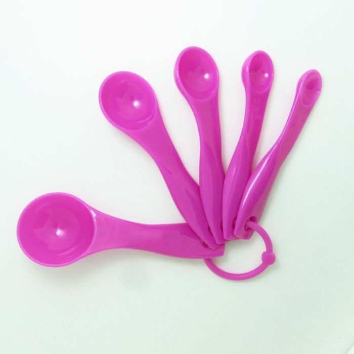 Five pink spoons clearly labeled for accurate baking and cooking: