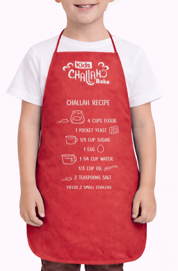 Each apron comes pre-printed with a challah recipe for 2 Challahs, making the baking experience more interactive and easy for children to follow.