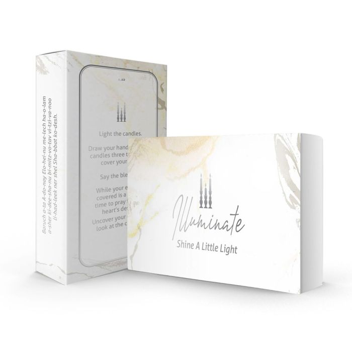 Silver White Illuminating Candlelighting Box – made to fit 3 standard tealights (not included). Elegant and inspirational, this box-only option includes beautifully printed candlelighting blessings in Hebrew, English, and transliteration. Created especially to encourage families to light together with their children.