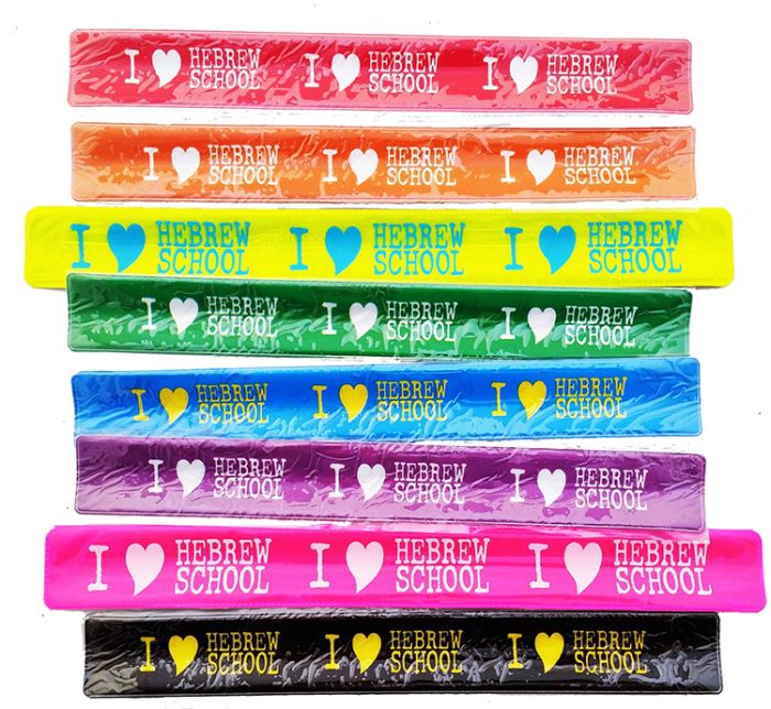 These Hebrew School Slap bands are the perfect way to; start and end your Hebrew School, or promote it throughout the year! You can even coordinate it with their corresponding Aleph Champ level! They come in 10 colors: White, Red, Orange, Yellow, Green, Blue, Purple, Brown, Grey, and Black