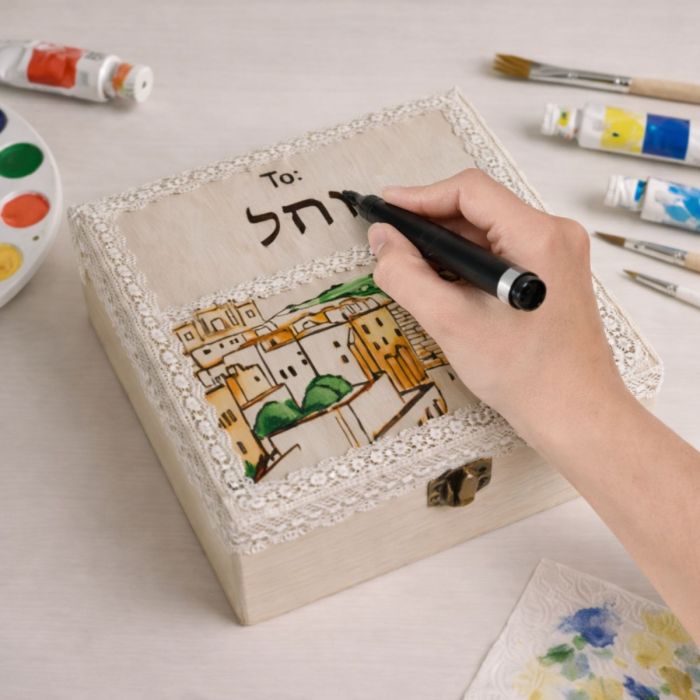 Small Wooden Purim Tea Box – Jerusalem & Western Wall Design
