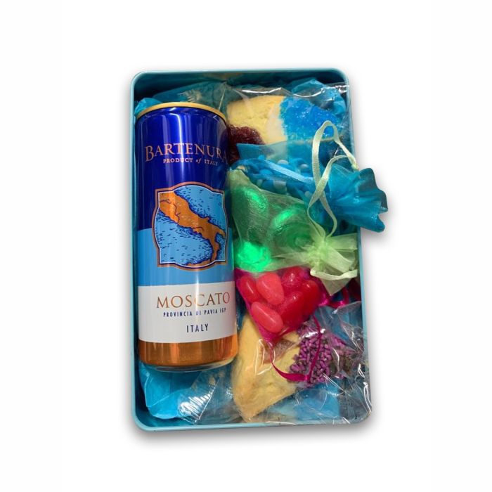 Smaller FILLED Happy Purim Shaloch Manos Tin Drink, Hamantashen, Chocolate, Mints, Jelly Beans