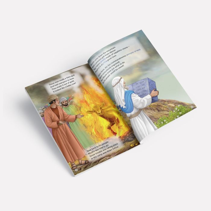 The Yom Kippur story goes back in time to the birth of the Jewish Nation and the Giving of the Torah. Trouble began when the new nation thought their leader Moshe was gone. They were quickly convinced that worshiping a golden calf would keep them safe in the desert. They forgot what they had just heard at Har Sinai: not to worship anything besides Hashem. Mosheâs shocking action upon his return helped them realize their terrible mistake. But was it already too late to save the Jewish People? This captivating book retells how Moshe and the Jewish Nation were able to turn things around. Their sincere efforts to return to Hashem gave us the holiday of Yom Kippur forever, and the power to always make our connection to the One Above even better than before!