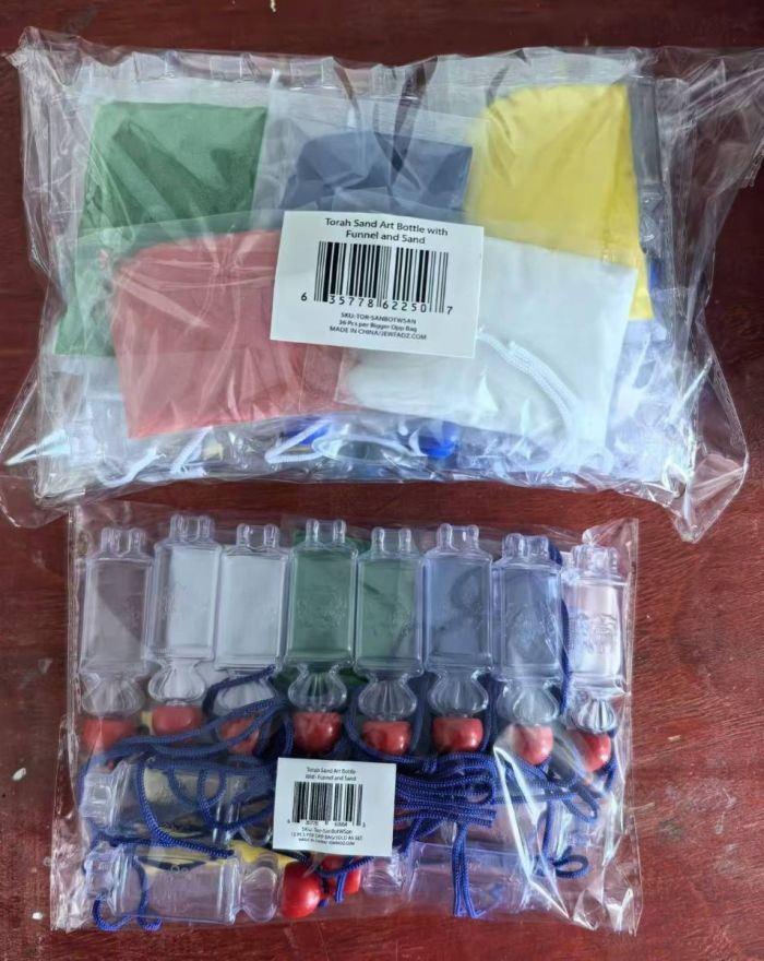 Celebrate Jewish traditions like Simchat Torah, Siyum Sefer Torah dedications, and Shabbat with our Torah Sand Art Bottles kit! This fun and creative kit includes 12 Torah-shaped bottles (each with a 0.5 oz sand capacity, 1L x 0.5W x 3.4H inches) and 1 funnel, along with enough sand for all 12 bottles in 5 vibrant colors: red, yellow, blue, green, and white.