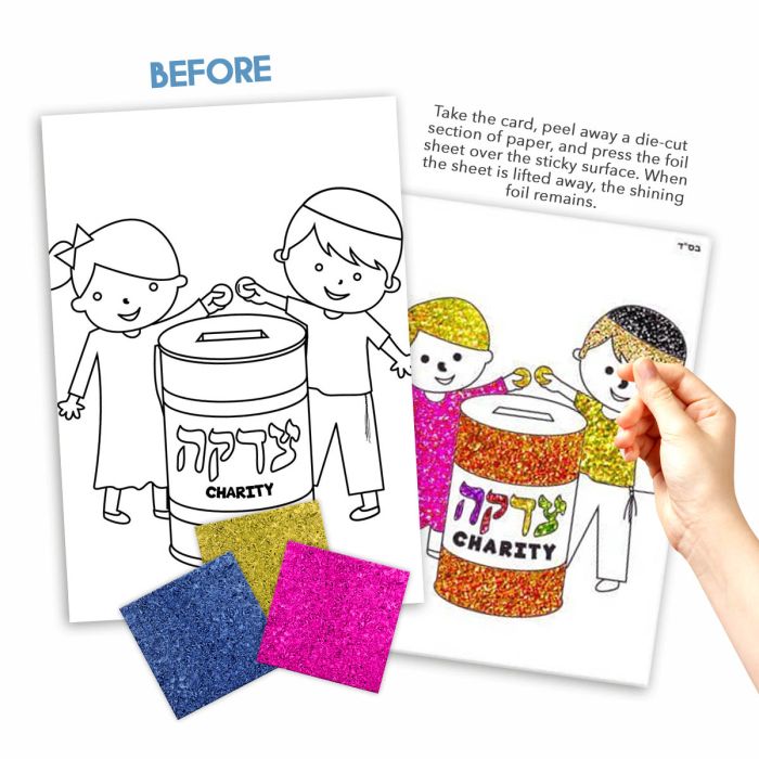 | Chabad Hebrew School Foil Art Craft Kit – 5 x 7 Sparkle Activity | The items is bundled as Packs of 12, Packs of 36, Case Quantity of 720. | The Weight for each bundle is 0.32 lbs for the 12 Pack, 0.95 lbs for the 36 Pack, 19.05 lbs for the case. | The Dimensions is 11.8 L x 9.6 W x 10.2 H inches for the case. |
