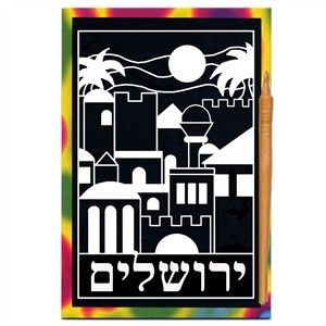 Yerushalayim( in Hebrew) scratch art  boards and wooden stylus set. Scratch surface of the board and reveal rainbow colors.